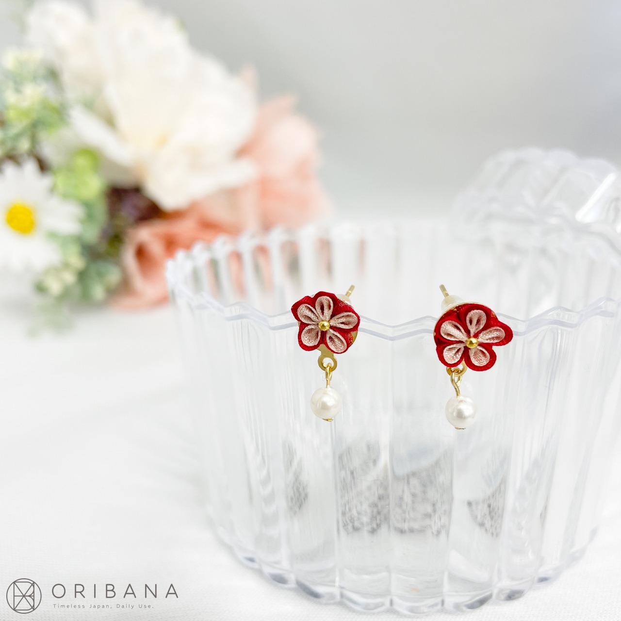 小花をモチーフに、羽二重(レーヨン)素材で仕上げたつまみ細工のピアスです。