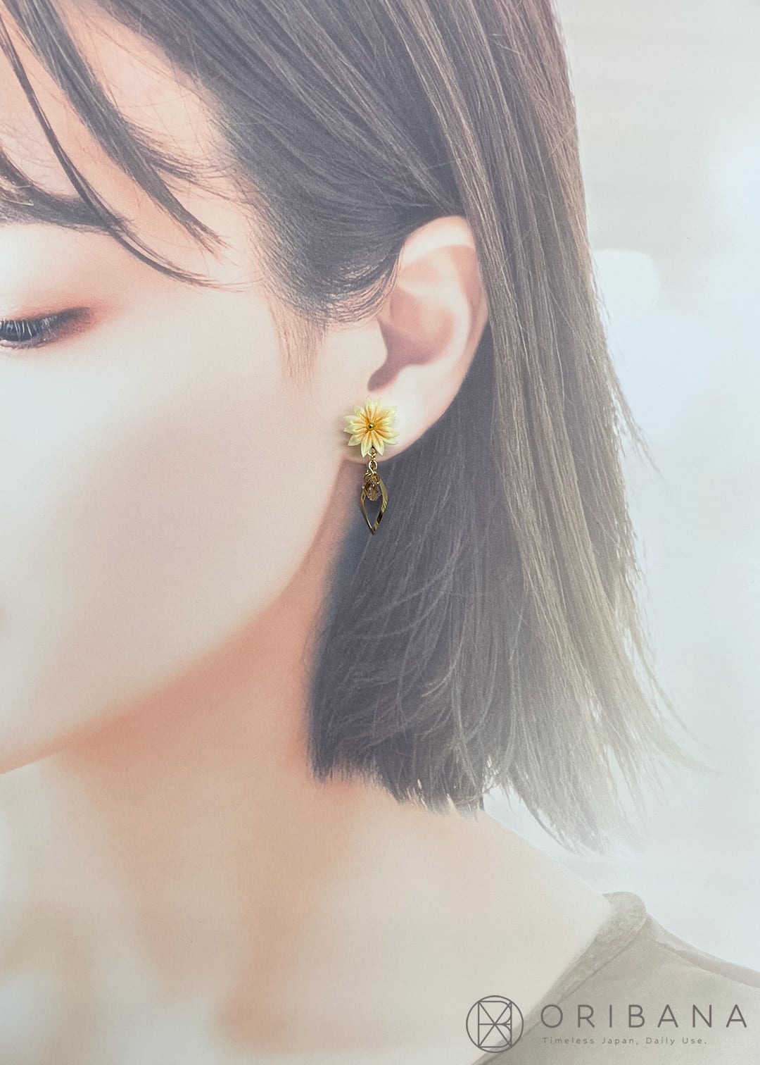 ダリアの花をモチーフに、羽二重(レーヨン)素材で仕上げたつまみ細工のピアスです。